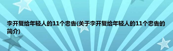 大家好,李开复给年轻人的11个忠告,关于李开复给年轻人的11个忠告的简介很多人还不知道,现在让我们一起来看看吧!