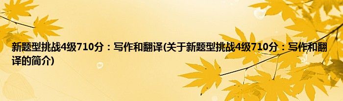 最佳答案大家好,新题型挑战4级710分:写作和翻译,关于新题型挑战4级710分:写作和翻译的简介很多人还不知道,现在让我们一起来看看吧! 1、 《新题型挑战4级710分写作和翻译》是2006年外语教学与研究出版社出版的图书。2、 。本文关于新题型挑战4级710分:写作和翻译的简介就讲解完毕,希望对大家有所帮助。