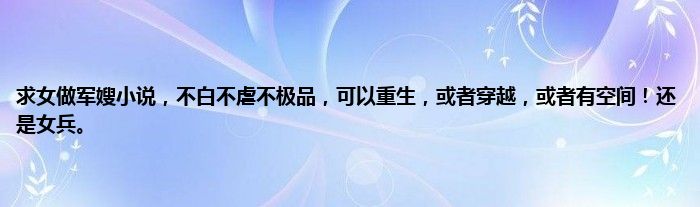 大家好,小常来为大家解答以上问题。求女做军嫂小说,不白不虐不极品,可以重生,或者穿越,或者有空间!还是女兵。很多人还不知道,现在让我们一起来看看吧!