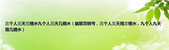 答案是:九个人九天用27桶水。该题类似于脑筋急转弯,但实际上是一个数学计算的问题。根据题意,三个人三天用3桶水,那么可以得知:一个人三天用1桶水。进而可推出一个人九天用了1×3=3桶水,那么九个人九天用了9×3=27桶水。解答这个问题不能马上就按照字面意思去理解,三个人三天用三桶水,很多人下一个反应就是:九个人九天用九桶水,但实际上这是一个错误的答案,这个题目里面包含了一个数学计算的过程,而不是单纯的挖题目的字眼就能说出答案来。扩展资料:这个问题可以从多个方向可以解答,因为题目本身就缺乏严谨,但是各个方法求得的结果都是一致的。方法一:三个人三天用3桶水,可以理解为:三个人一天用1桶水。那么三个人九天用1×9=9桶水,所以九个人九天用了3×9=27桶水。方法二:三个人三天用3桶水,可以理解为:一个人一天用1/3桶水,那么九个人一天用(1/3)×9=3桶水,那么九个人九天用3×9=27桶水。垍