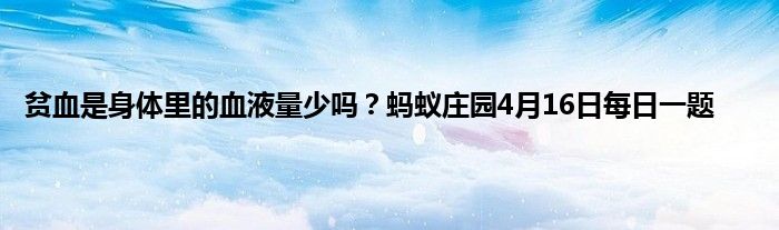 大家好,蚂蚁庄园今天的问题是贫血是身体里的血液量少吗?和健康类的问题有关,贫血是指的人体的血红蛋白低于正常值的下限,一般男性低于120克每升,那么问题的答案是什么呢,小编收集和整理了相关答案以及解析,下面一起来看看吧!