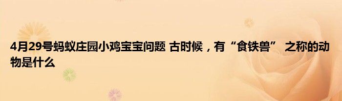 4月29号蚂蚁庄园小鸡宝宝问题,古时候,有“食铁兽” 之称的动物是什么,欢迎大家来到这里,能进来的小伙伴都有玩蚂蚁庄园的,支付宝蚂蚁庄园每天都会在小课堂更新一道题目,答对即可领取小鸡饲料180G,4月29日蚂蚁庄园问题是:古时候,有“食铁兽” 之称的动物是?很多小伙伴都不知道古时候,有“食铁兽” 之称的动物是是这个问题的答案是什么,那么小编就为大家分享下4月29日蚂蚁庄园课题问题的答案,希望对大家有所帮助!