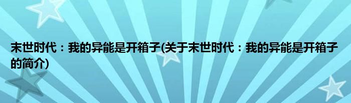大家好,末世时代:我的异能是开箱子,关于末世时代:我的异能是开箱子的简介很多人还不知道,现在让我们一起来看看吧!